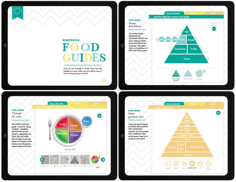 Conceptual: Created mock interactive tablet program 'Mastering Food Guides' for fun food guide exploration & nutrition management.