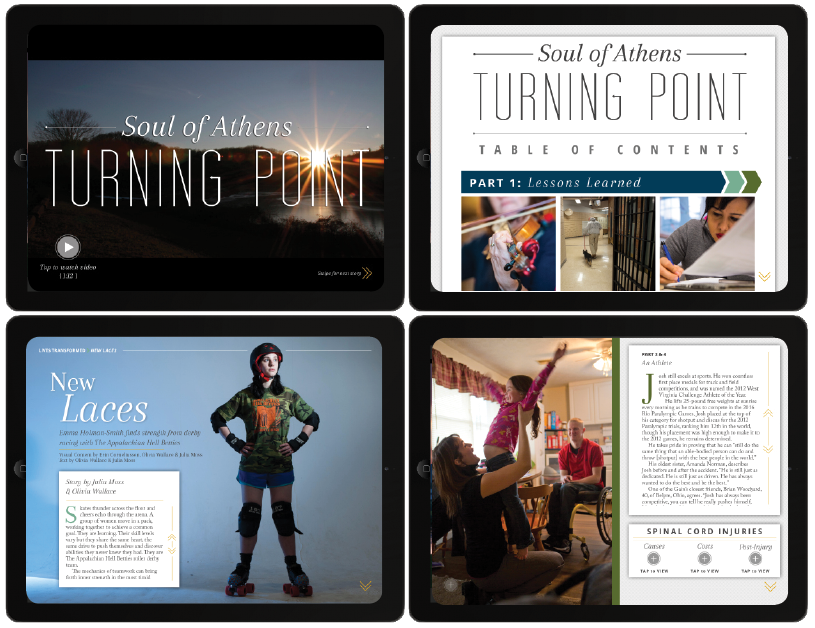 Soul of Athens: Designed one of the first proposed interactive publications at Ohio University. The project theme, 'Turning Point', reveals the impact of profound moments in people's lives from Southeast Ohio.